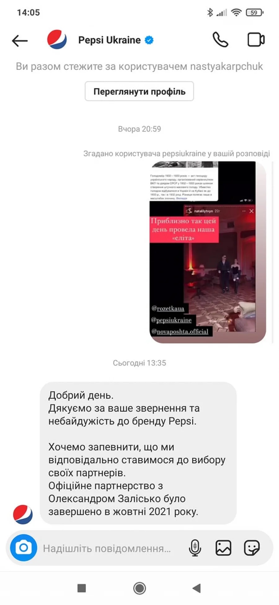 В ответе Pepsi Ukraine говорится, что компания ответственно относится к своим партнерам, и что партнерство с Залиско было прекращено еще в октябре 2021 года (!) И это очень странно с учетом того, что скандал возник только сегодня.