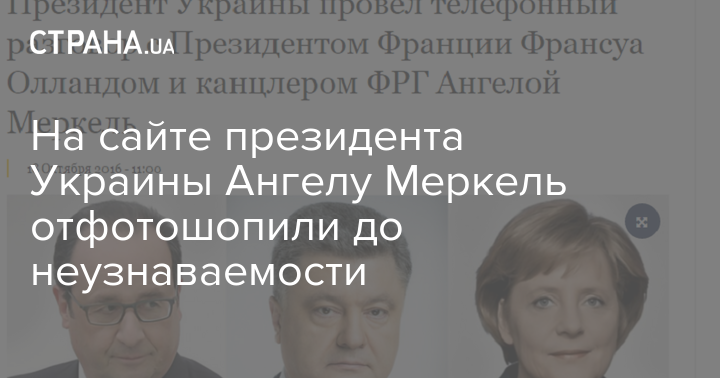 "Отфотошопленную" фотографию Меркель выставили на сайте президента в качестве иллюстрации к новости "Президент Украины провел телефонный разговор с Президентом Франции Франсуа Олландом и канцлером ФРГ Ангелой Меркель". На фото отредактированы возрастные несовершенства, а лицо Меркель выглядит уже, чем на оригинальном фото. В результате обработки в фоторедакторе изменился также цвет и структура лацкана пиджака (см. коллаж).