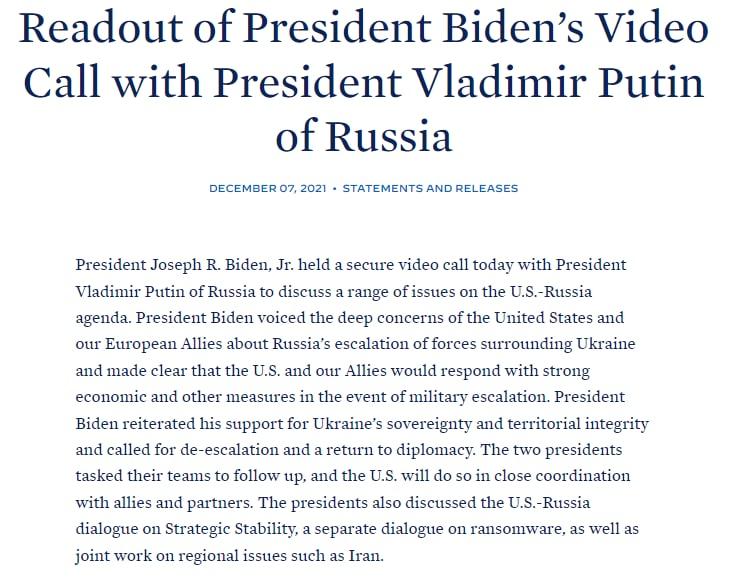 Важная ремарка из пресс-релиза Байдена - что переговоры по Украине будут продолжаться.