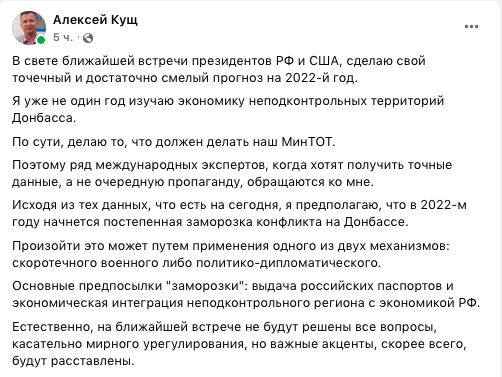 Исходя из тех данных, что есть на сегодня, я предполагаю, что в 2022-м году начнется постепенная заморозка конфликта на Донбассе.