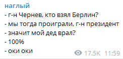 Чуть позже Назаров опубликовал пост, в котором прошелся по основным вехам истории и описал возможный диалог между Черневым и Зеленским, дед которого служил в рядах советской "Красной армии":