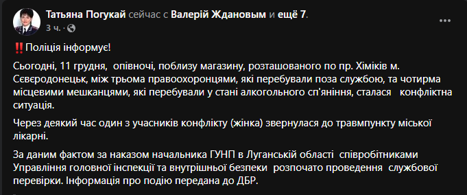 В городе Северодонецк Луганской области сегодня ночью произошла драка между тремя полицейскими и четырьмя гражданскими. В результате чего пострадала одна из участников конфликта.