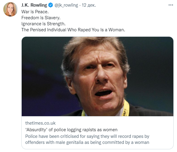 "Война — это мир. Свобода — это рабство. Невежество — это сила. Насильник с членом — это женщина", - прокомментировала гендерную политику полиции в своем Твиттере Роулинг, цитируя строчки из романа-антиутопии Джорджа Оруэлла "1984".