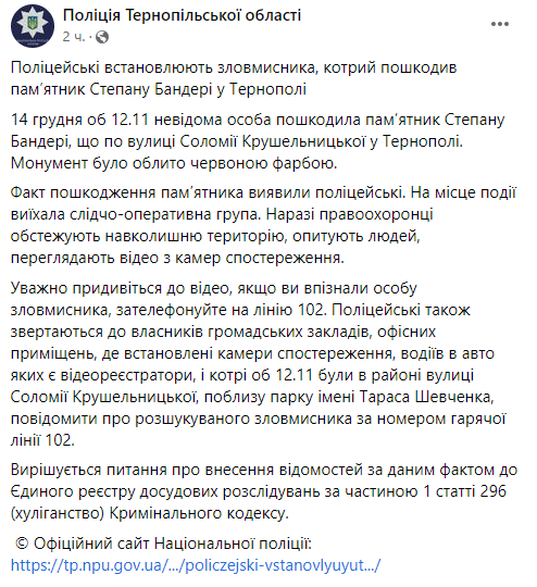 "Внимательно присмотритесь к видео, если вы узнали личность злоумышленника, позвоните по телефону на линию 102. Полицейские также обращаются к владельцам общественных заведений, офисных помещений, где установлены камеры наблюдения, водителей в авто которых есть видеорегистраторы, и которые в 12.11 были в районе. вблизи парка имени Тараса Шевченко, сообщить о разыскиваемом злоумышленнике по номеру горячей линии 102", - говорится в сообщении полиции.