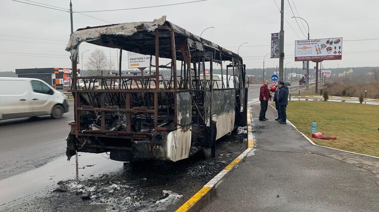 В четверг, 26 декабря, в городе Ирпень, что в Киевской области, полностью сгорела маршрутка сообщением "Ирпень-Киев". В салоне находились 20 пассажиров, к счастью, никто не пострадал.