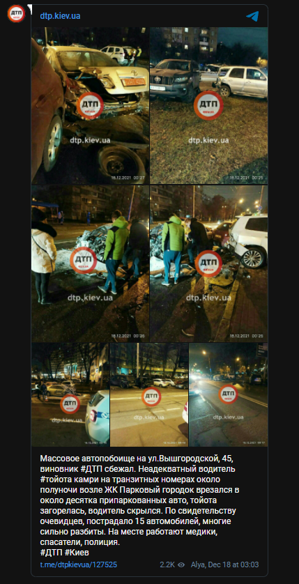 В ночь на субботу, 18 декабря, в Оболонском районе Киева легковой автомобиль Toyota Camry столкнулся с более десятью припаркованными у дороги авто и загорелось. При этом водитель с места происшествия скрылся.