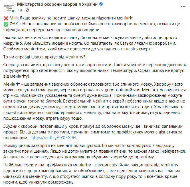 В Министерстве здравоохранения Украины рассказали о том, что отсутствие шапки в холодное время года не связано с менингитом, так как это инфекция от человека к человеку.