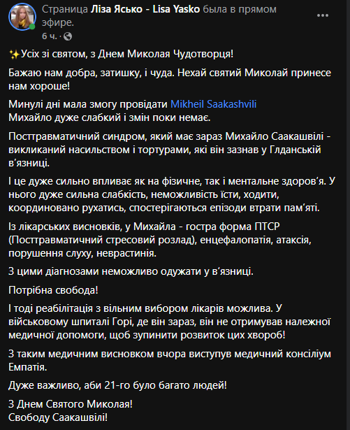 "Он очень слаб, и в этом направлении нет ничего нового. Могу еще раз сказать, что процесс реабилитации должен проходить на свободе. Посттравматический синдром, который есть у Михаила Саакашвили, влияет как на физическое, так и на ментальное здоровье. У него наблюдаются эпизоды потери памяти, что вызвано тем насилием и пытками, которым он подвергся в Глданской тюрьме", - объяснила Ясько.