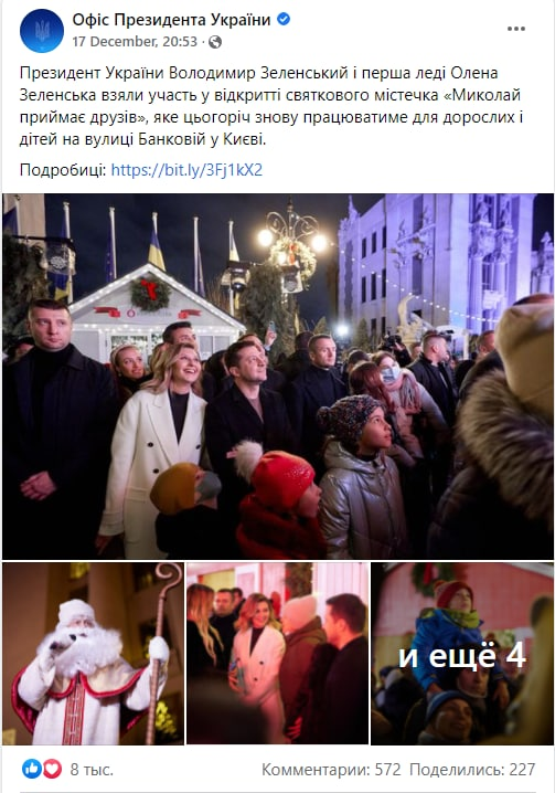 Президент Украины Владимир Зеленский совместно со своей супругой Еленой Зеленской на днях приняли участие в открытии праздничного городка "Николай принимает друзей", который в этом году снова будет работать для взрослых и детей на улице Банковой в Киеве.