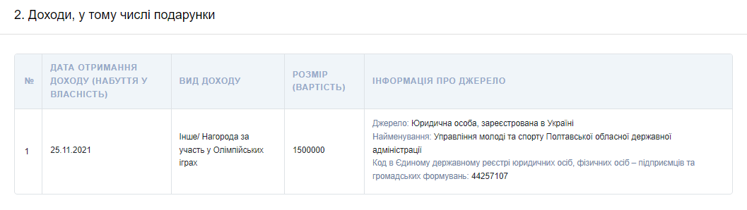 Также депутат 9 августа получил 3,3 млн гривен награды за участие в Олимпийских играх (социальные выплаты).