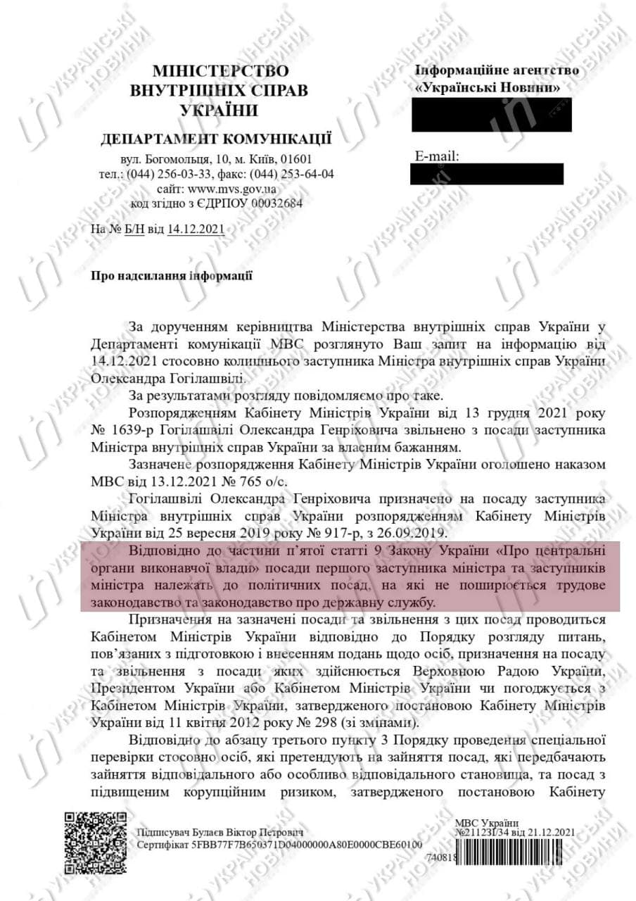 Гогилашвили не проходил проверку перед назначением на пост замминистра МВД. Документ