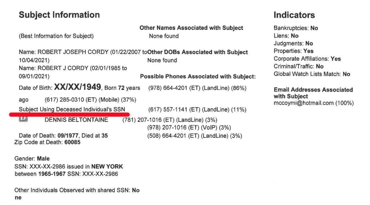 Американский юрист Роберт Корди, который назначен в Украине в состав Этического совета и будет проверять соответствие кандидатов на должность члена Высшего совета правосудия критериям профессиональной этики и добродетели, использует в США чужой номер социального страхования (SSN). Документ принадлежит 35-летнему Деннису Белтонтейну, который жил в штате Иллинойс и скончался в 1977 году.