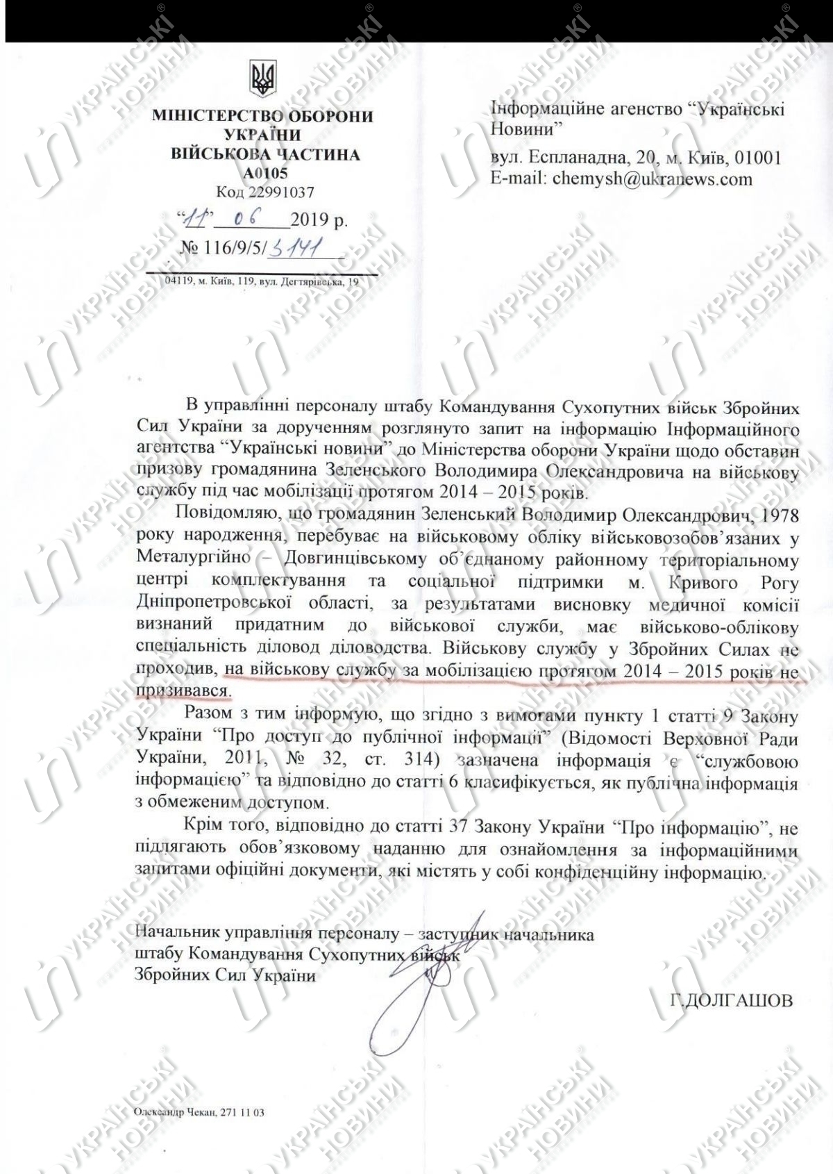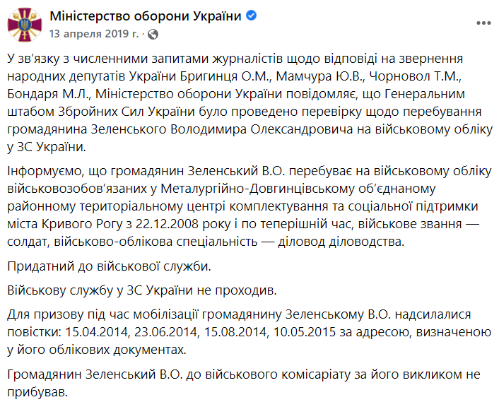 На запрос "Украинских новостей" ведомство летом 2019 года заявило, что Зеленский на военную службу в ходе мобилизации не призывался. На вопрос, приходили ли ему повестки, Минобороны отвечать не стало, сославшись на секретность этих данных.