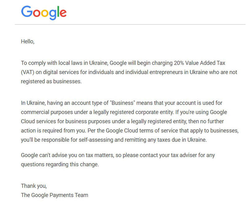 "Во исполнение местного законодательства в Украине Google начинает взимать 20% НДС на цифровые услуги для физических лиц и предпринимателей в Украине, которые не зарегистрированы как бизнес", - говорится в заявлении компании.