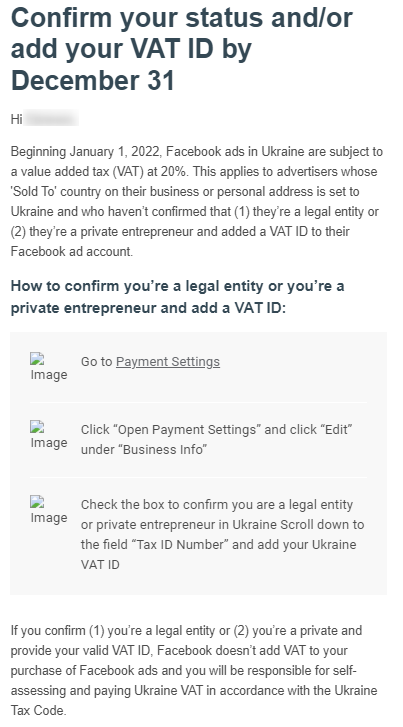 "Если вы... предоставляете свой действующий идентификатор плательщика НДС, Facebook не добавляет НДС к вашей покупке рекламы, и вы будете нести ответственность за уплату НДС в соответствии с Налоговым кодексом Украины", - говорится в сообщении.