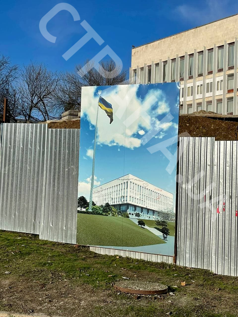 В Херсоне не стали ремонтировать рухнувший флагшток, а поставили его изображение. Фото: Скриншот из видео