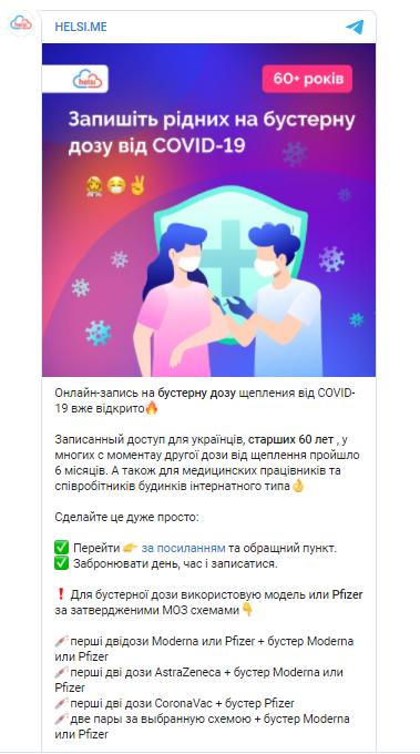 "Запись доступна для украинцев старше 60 лет, у которых с момента второй дозы от прививки прошло 6 месяцев. А также для медицинских работников и сотрудников домов интернатного типа", - говорится в сообщении.