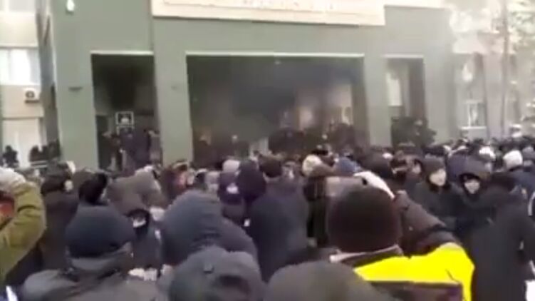 До этого протестующие разбили окна здания, пишет "Радио Азаттык". Были слышны взрывы светошумовых гранат и выстрелы. В здание через разбитые окна и двери ворвались протестующие, позднее их вытеснили силовые ведомства. Из здания идет густой черный дым. На улицах города идут столкновения полицейских с митингующими, у одного из силовиков участники протестов отняли оружие.