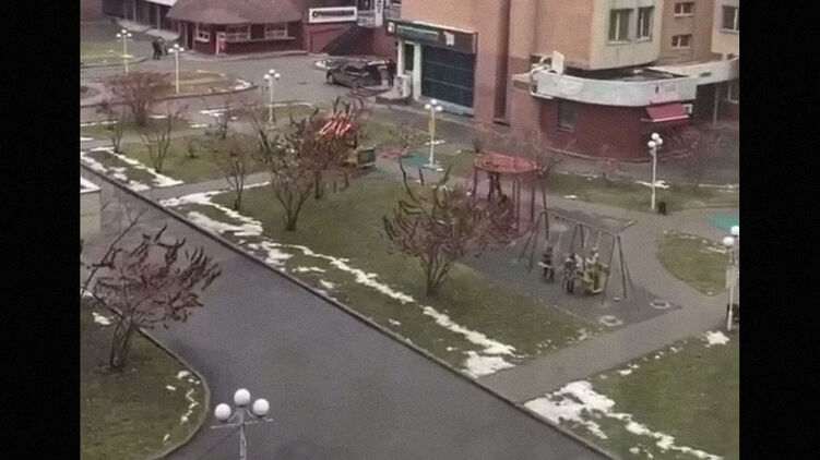 На видео небольшая группа ребят катается на качелях и спокойно играет. Рядом проходит задумчивый мужчина, который явно не торопится. Все бы ничего, однако удивляет факт того, что слышны взрывы и выстрелы.