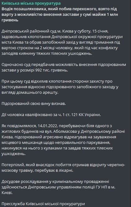 "Днепровский районный суд г. Киева в субботу, 15 января, удовлетворил ходатайство Днепровской окружной прокуратуры города Киева и избрал меру пресечения в виде ареста сроком на 2 месяца мужчине, который причинил киевлянину тяжкие телесные повреждения в ходе конфликта", - говорится в сообщении.
