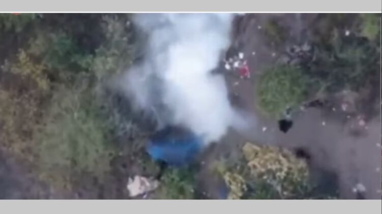 На видео можно заметить, как небольшие бомбы, оснащенные парашютами, сбрасываются с беспилотника, а затем взрываются, вызывая пожар. Люди выбегают из-под деревьев и бросаются в разные стороны.