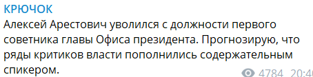 "Алексей Арестович уволился с должности первого советника главы Офиса президента. Прогнозирую, что ряды критиков власти пополнились содержательным спикером".