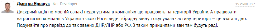 "Дискриминация по языковому признаку недопустима в работающих на территории Украины компаниях. А работать на российские компании из Украины, с которой Россия ведет гибридную войну и оккупировала часть территории - это вообще дно. Подумайте о переезде в так называемые ДНР/ЛНР или РФ. С такими принципами вам там будут рады".