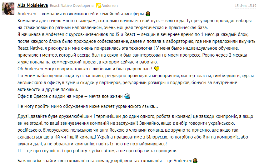 Сотрудники компании стали в защиту Andersen, написав, что это компания возможностей и семейной атмосферы, которая очень много дает стажерам и регулярно проводит наборы на стажировки по разным направлениям, а в вопросах языка придерживается принципов компромисса и толерантности.