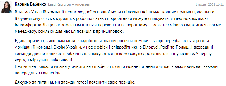 Единственная причина, по которой вам может понадобиться знание русского языка - если предполагается работа в смешанной команде. Кроме Украины, у нас есть офисы и сотрудники в Беларуси, России и Польше. И внутри команды действительно возникает необходимость общаться на том языке, который понимают все его участники. В первую очередь, из соображений вежливости. Этот момент всегда можно уточнить на собеседовании и, если языковой вопрос для вас важен, вас всегда предупредят заранее", - написала она.