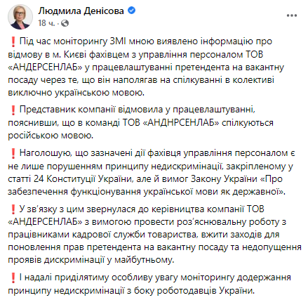 "Проблема, полагаем, в том, что у кандидата сложилось впечатление, якобы в компании не разговаривают на украинском языке. Хоть на самом деле речь шла про международную команду отдельно взятого проекта", - заявил он.
