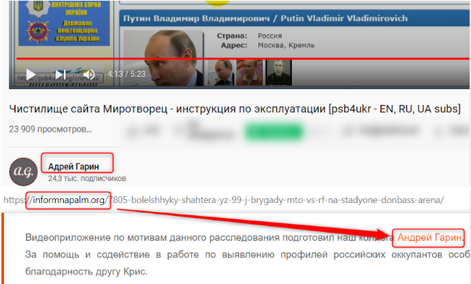 Есть и много других данных о том, что активисты "Напалма" - это одна команда с "Миротворцем". Так, киевлянин Андрей Гарин, судя по его YouTube-каналу и упоминаниям на сайте "Напалма", делает пропагандистские ролики для обоих сайтов.