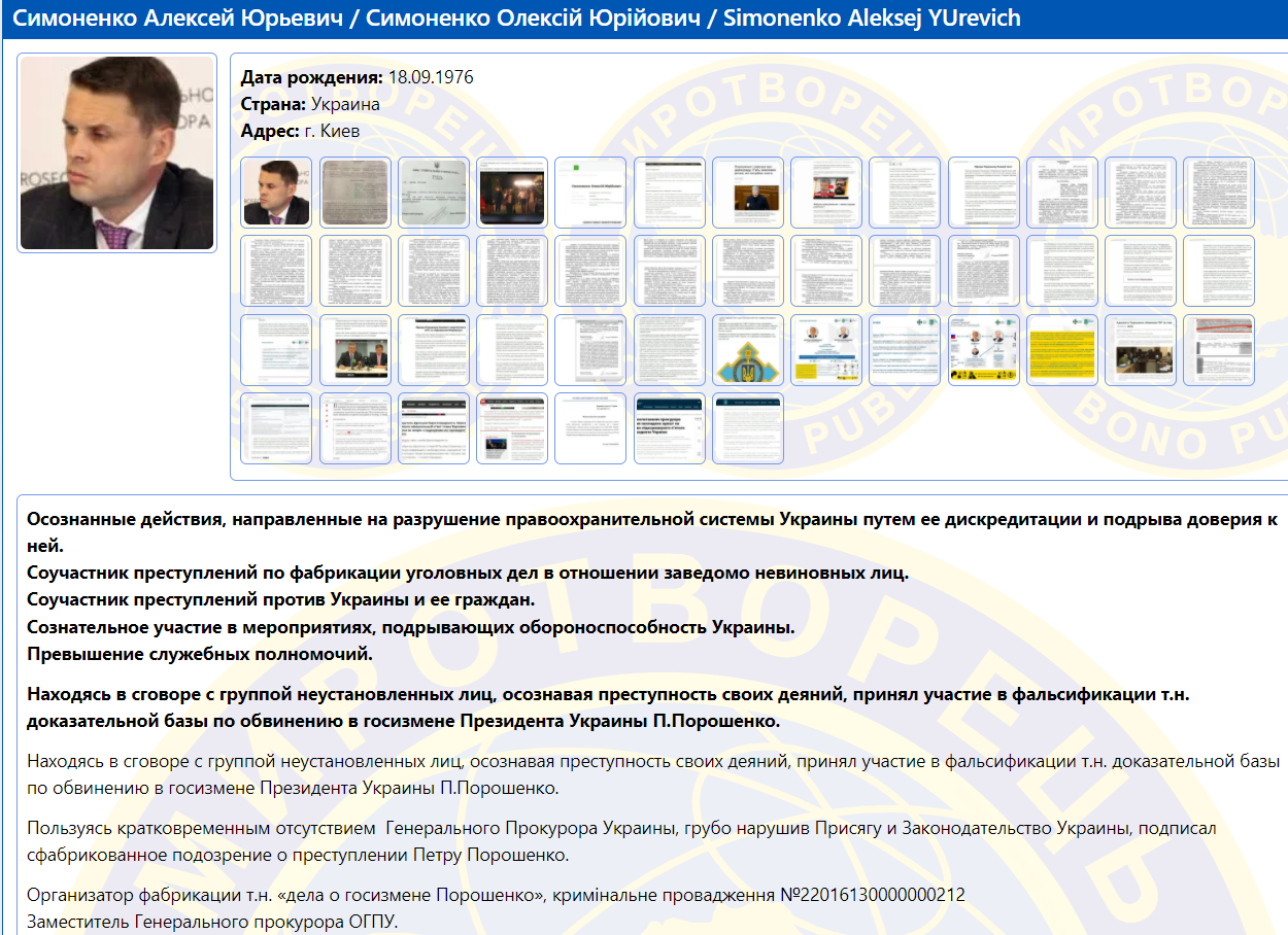 Ярко выраженной "местью Порошенко" стало появление на этом ресурсе заместителя генпрокурора Алексея Симоненко, подписавшего подозрение против бывшего президента по "угольному делу".