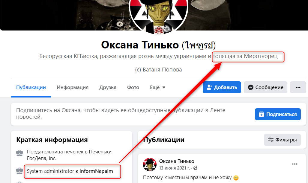 Тинько в соцсетях себя позиционирует как системный администратор "ИнформНапалма" и не скрывает на Facebook, что "топит за Миротворец".