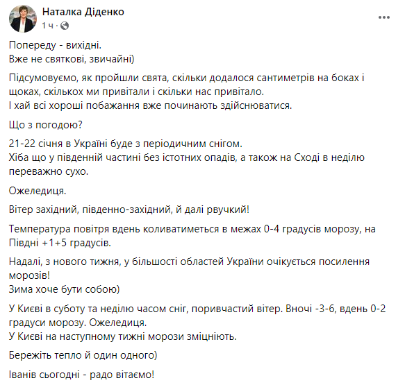 "21-22 января на Украине будет с периодическим снегом. Разве что в южной части без существенных осадков, а также на Востоке в воскресенье преимущественно сухо. Гололедица. Ветер западный, юго-западный, и дальше порывистый!" - предупреждает синоптик.