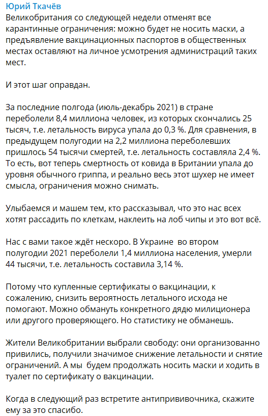"За последние полгода (июль-декабрь 2021) в стране (Великобритании - Ред.) переболели 8,4 миллиона человек, из которых скончались 25 тысяч, т.е. летальность вируса упала до 0,3 %. Для сравнения, в предыдущем полугодии на 2,2 миллиона переболевших пришлось 54 тысячи смертей, т.е. летальность составляла 2,4%. То есть, вот теперь смертность от ковида в Британии упала до уровня обычного гриппа, и реально весь этот шухер не имеет смысла, ограничения можно снимать.
