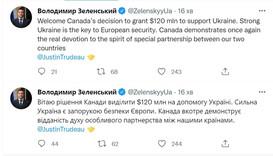 "Приветствую решение Канады выделить $120 млн на помощь Украине. Сильная Украина является залогом безопасности Европы. Канада еще раз демонстрирует приверженность духу особого партнерства между нашими странами", - написал он.