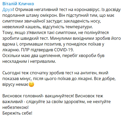 "Друзья! Новость для меня – неутешительная. Получил положительный результат теста Covid-19. Заболел уже вторично. Поскольку вакцинирован, надеюсь на несложное течение болезни. Самоизолировался, лечусь и работаю из дома", - написал Виталий Кличко.