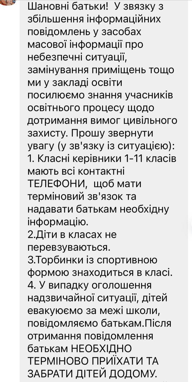 А родителям разослали сообщения, в которых говорится, что нужно быть готовым срочно ехать забирать ребенка в случае получения сообщения от администрации школы.