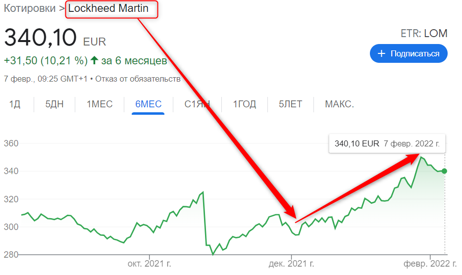 Кстати, их котировки с декабря уверенно пошли в рост. У "Локхид Мартин" стоимость акции возросла с 295 евро 1 декабря до 350 в конце января.