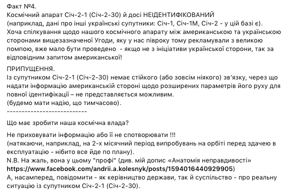 "Со спутником "Сич-2-1" нет устойчивой (или совсем никакой) связи, поэтому предоставить информацию американской стороне относительно расширенных параметров его движения для полной идентификации не представляется возможным (будем надеяться, что временно).