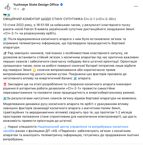 23 января бывший советник главы Государственного космического агентства Украины Андрей Колесник написал в Facebook, что по прошествии десяти дней после запуска "Сич" до сих пор не вышел на связь.