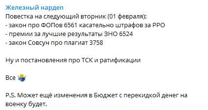 Также Железняк не исключает, что могут рассмотреть Бюджет "с перекидкой денег на военку".