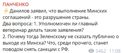 "Два вопроса: 1. Уполномочен ли главный ветеринар делать такие заявления? 2. Почему тогда Зеленскому не сказать публично о выходе из Минска? Что, среди прочего, станет поводом снять санкции с РФ".