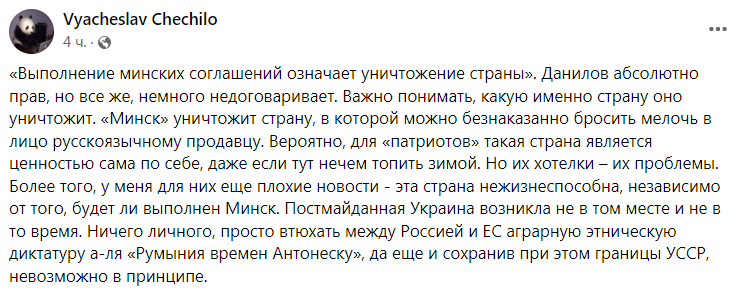 "Выполнение минских соглашений означает уничтожение страны". Данилов абсолютно прав, но все же немного недоговаривает. Важно понимать, какую именно страну оно уничтожит. "Минск" уничтожит страну, в которой можно безнаказанно бросить мелочь в лицо русскоязычному продавцу. Вероятно, для "патриотов" такая страна является ценностью сама по себе, даже если тут нечем топить зимой. Но их хотелки – их проблемы. Более того, у меня для них еще плохие новости - эта страна нежизнеспособна, независимо от того, будет ли выполнен Минск. Постмайданная Украина возникла не в том месте и не в то время. Ничего личного, просто втюхать между Россией и ЕС аграрную этническую диктатуру а-ля "Румыния времен Антонеску", да еще и сохранив при этом границы УССР, невозможно в принципе".