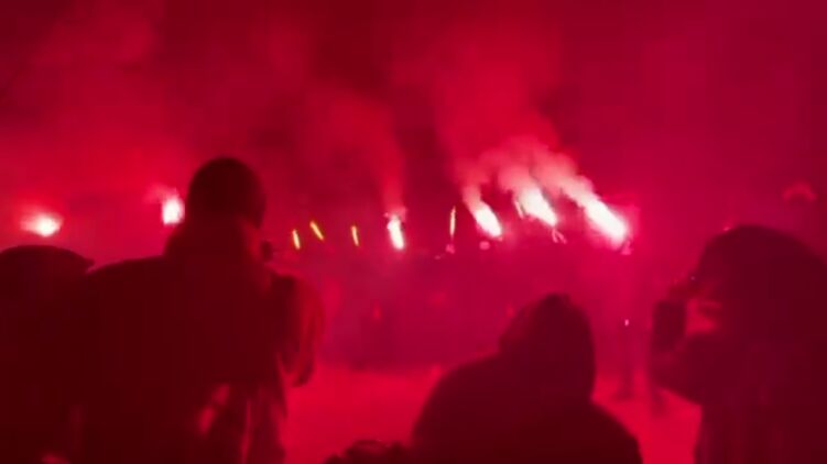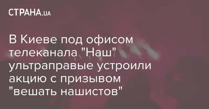 Под офисом телеканала "Наш" в Киеве во вторник вечером ультраправые устроили акцию. Они жгут файеры, кричат "русский, сдавайся" и призывают "вешать нашистов".