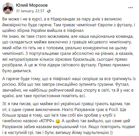 "Некто Разуванов играет в России. Еще большая зрада в том, что имя там он сделал в клубе с позорным названием "КПРФ". А только что получилось, что именно этот Разуванов забил казахам решающий гол. Если повторит подвиг и в следующей игре, так и быть, выпишу ему индульгенцию", - пишет Юлий Морозов.