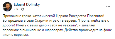 Прихожане греко-католической Церкви Рождества Пресвятой Богородицы в селе Старичи Львовской области устроили вертеп с элементами антисемитизма.