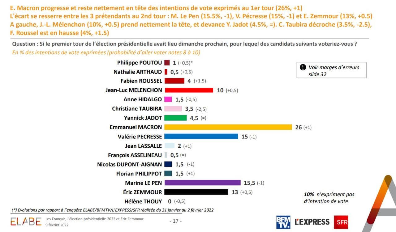 "Из его оппонентов самая сильная - Марин Ле Пен, и могла бы составить конкуренцию во втором туре, но ее соперник на правом поле Земмур забрал 15% от ее избирателей", - говорит Арфуш.