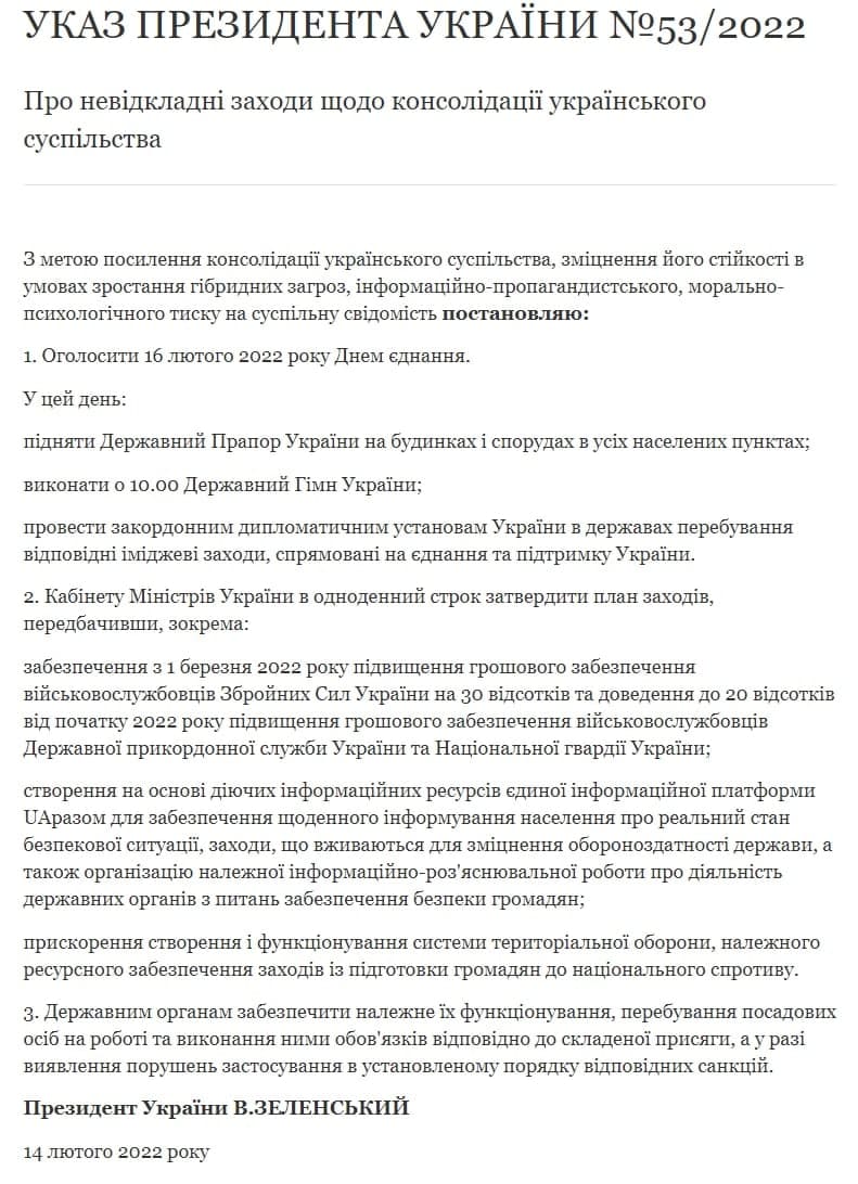 Президент Украины Владимир Зеленский, который призвал украинцев в "день вторжения" 16 февраля одеть синие-желтые ленточки, подписал соответствующий указ №53/2022 "О неотложных мерах по консолидации украинского общества", который размещен на сайте главы государства.