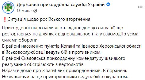 Залужный заверил, что по состоянию на 00:00 25 февраля группировка сил обороны ведет организованную оборонную операцию на юге. Идут оборонительные бои в районе восточнее Херсона. Механизированные подразделения ВСУ отбили автомобильный мост и закрепились на левом берегу Днепра.